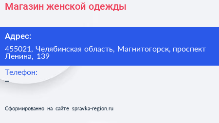 Магазин женской одежды по адресу 455021, Челябинская область, Магнитогорск, проспект Ленина, 139 в дальнейшем Организация, размещена в следующих категориях:
