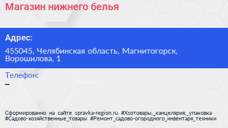 Магазин нижнего белья по адресу 455045, Челябинская область, Магнитогорск, Ворошилова, 1 в дальнейшем Организация, размещена в следующих категориях: