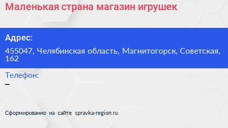 Маленькая страна, магазин игрушек по адресу 455047, Челябинская область, Магнитогорск, Советская, 162 в дальнейшем Организация, размещена в следующих категориях: