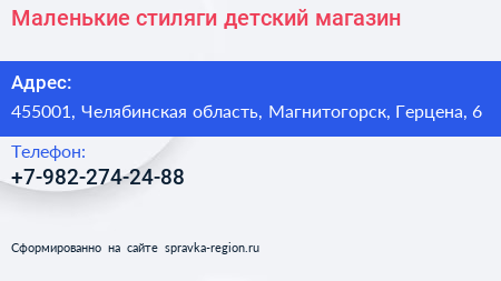 Маленькие стиляги, детский магазин по адресу 455001, Челябинская область, Магнитогорск, Герцена, 6 в дальнейшем Организация, размещена в следующих категориях: