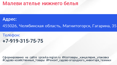Малеви, ателье нижнего белья по адресу 455026, Челябинская область, Магнитогорск, Гагарина, 35 в дальнейшем Организация, размещена в следующих категориях: