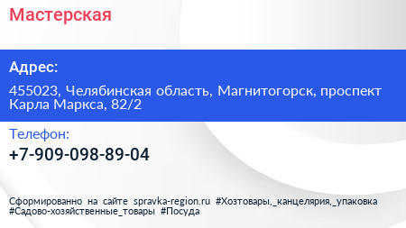 Мастерская по адресу 455023, Челябинская область, Магнитогорск, проспект Карла Маркса, 82/2 в дальнейшем Организация, размещена в следующих категориях: