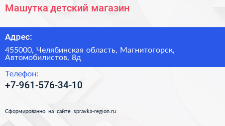 Машутка, детский магазин по адресу 455000, Челябинская область, Магнитогорск, Автомобилистов, 8д в дальнейшем Организация, размещена в следующих категориях: