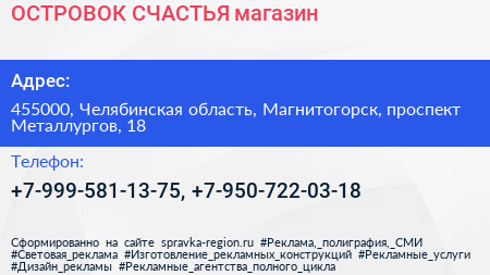ОСТРОВОК СЧАСТЬЯ, магазин по адресу 455000, Челябинская область, Магнитогорск, проспект Металлургов, 18 в дальнейшем Организация, размещена в следующих категориях: