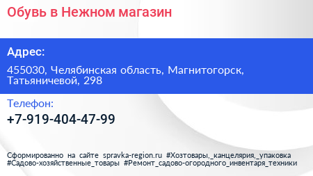 Обувь в Нежном, магазин по адресу 455030, Челябинская область, Магнитогорск, Татьяничевой, 298 в дальнейшем Организация, размещена в следующих категориях: