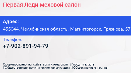 Первая Леди, меховой салон по адресу 455044, Челябинская область, Магнитогорск, Грязнова, 57 в дальнейшем Организация, размещена в следующих категориях: