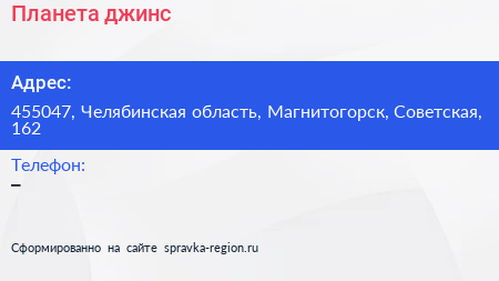 Планета джинс по адресу 455047, Челябинская область, Магнитогорск, Советская, 162 в дальнейшем Организация, размещена в следующих категориях: