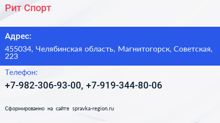 Рит Спорт по адресу 455034, Челябинская область, Магнитогорск, Советская, 223 в дальнейшем Организация, размещена в следующих категориях: