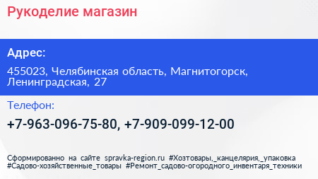 Рукоделие, магазин по адресу 455023, Челябинская область, Магнитогорск, Ленинградская, 27 в дальнейшем Организация, размещена в следующих категориях: