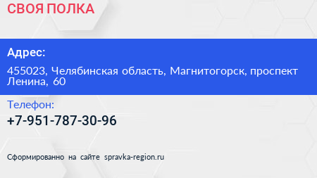 СВОЯ ПОЛКА по адресу 455023, Челябинская область, Магнитогорск, проспект Ленина, 60 в дальнейшем Организация, размещена в следующих категориях: