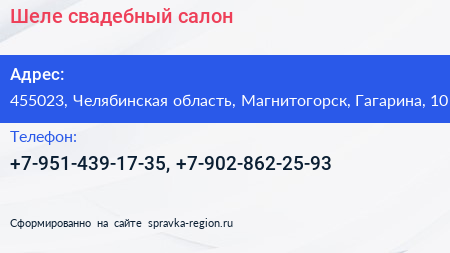 Шеле, свадебный салон по адресу 455023, Челябинская область, Магнитогорск, Гагарина, 10 в дальнейшем Организация, размещена в следующих категориях: