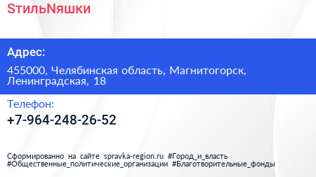 SтильNяшки по адресу 455000, Челябинская область, Магнитогорск, Ленинградская, 18 в дальнейшем Организация, размещена в следующих категориях: