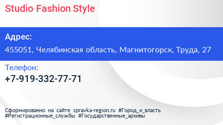 Studio Fashion Style по адресу 455051, Челябинская область, Магнитогорск, Труда, 27 в дальнейшем Организация, размещена в следующих категориях: