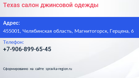 Texas, салон джинсовой одежды по адресу 455001, Челябинская область, Магнитогорск, Герцена, 6 в дальнейшем Организация, размещена в следующих категориях: