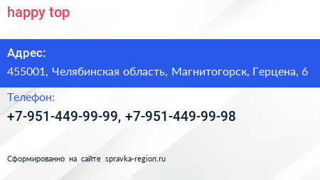 happy top по адресу 455001, Челябинская область, Магнитогорск, Герцена, 6 в дальнейшем Организация, размещена в следующих категориях: