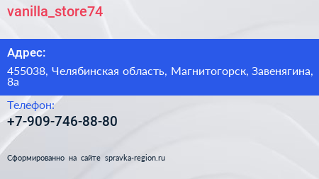 vanilla_store74 по адресу 455038, Челябинская область, Магнитогорск, Завенягина, 8а в дальнейшем Организация, размещена в следующих категориях: