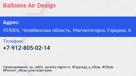 Balloons Air Design по адресу 455001, Челябинская область, Магнитогорск, Герцена, 6 в дальнейшем Организация, размещена в следующих категориях: