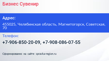 Бизнес Сувенир по адресу 455025, Челябинская область, Магнитогорск, Советская, 70 в дальнейшем Организация, размещена в следующих категориях: