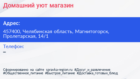Домашний уют, магазин по адресу 457400, Челябинская область, Магнитогорск, Пролетарская, 14/1 в дальнейшем Организация, размещена в следующих категориях: