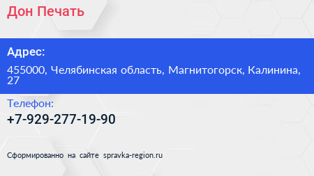Дон Печать по адресу 455000, Челябинская область, Магнитогорск, Калинина, 27 в дальнейшем Организация, размещена в следующих категориях: