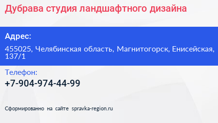 Дубрава, студия ландшафтного дизайна по адресу 455025, Челябинская область, Магнитогорск, Енисейская, 137/1 в дальнейшем Организация, размещена в следующих категориях: