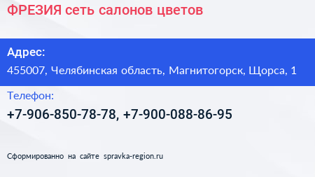 ФРЕЗИЯ, сеть салонов цветов по адресу 455007, Челябинская область, Магнитогорск, Щорса, 1 в дальнейшем Организация, размещена в следующих категориях: