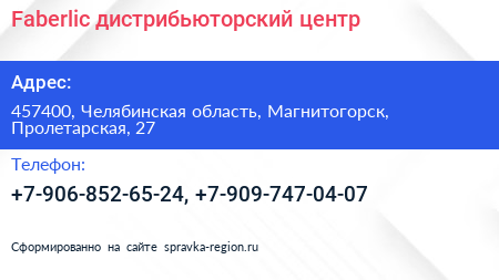 Faberlic, дистрибьюторский центр по адресу 457400, Челябинская область, Магнитогорск, Пролетарская, 27 в дальнейшем Организация, размещена в следующих категориях:
