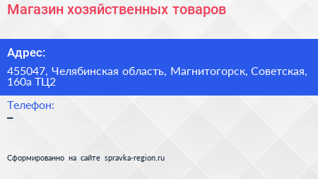 Магазин хозяйственных товаров по адресу 455047, Челябинская область, Магнитогорск, Советская, 160а ТЦ2 в дальнейшем Организация, размещена в следующих категориях: