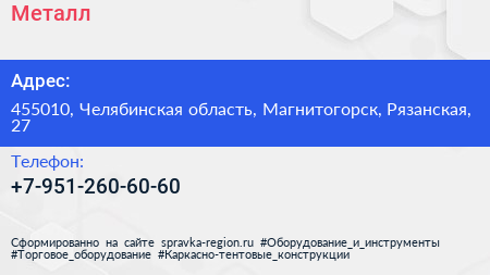 Металл+ по адресу 455010, Челябинская область, Магнитогорск, Рязанская, 27 в дальнейшем Организация, размещена в следующих категориях: