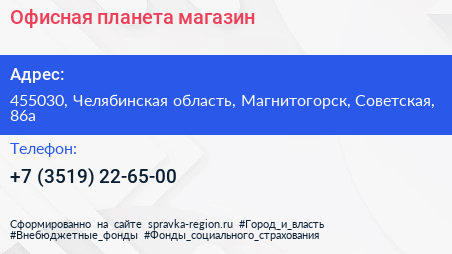 Офисная планета, магазин по адресу 455030, Челябинская область, Магнитогорск, Советская, 86а в дальнейшем Организация, размещена в следующих категориях:
