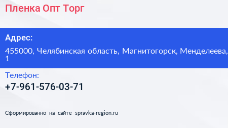 Пленка Опт Торг по адресу 455000, Челябинская область, Магнитогорск, Менделеева, 1 в дальнейшем Организация, размещена в следующих категориях: