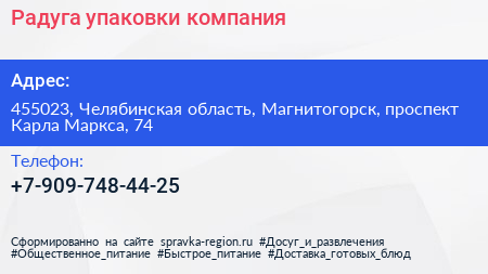 Радуга упаковки, компания по адресу 455023, Челябинская область, Магнитогорск, проспект Карла Маркса, 74 в дальнейшем Организация, размещена в следующих категориях: