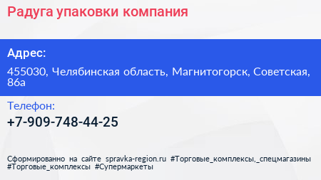 Радуга упаковки, компания по адресу 455030, Челябинская область, Магнитогорск, Советская, 86а в дальнейшем Организация, размещена в следующих категориях: