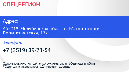 СПЕЦРЕГИОН по адресу 455019, Челябинская область, Магнитогорск, Большевистская, 13а в дальнейшем Организация, размещена в следующих категориях: