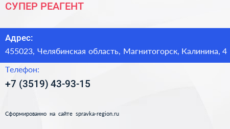 СУПЕР-РЕАГЕНТ по адресу 455023, Челябинская область, Магнитогорск, Калинина, 4 в дальнейшем Организация, размещена в следующих категориях:
