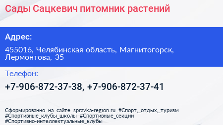 Сады Сацкевич, питомник растений по адресу 455016, Челябинская область, Магнитогорск, Лермонтова, 35 в дальнейшем Организация, размещена в следующих категориях: