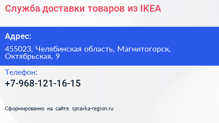 Служба доставки товаров из IKEA по адресу 455023, Челябинская область, Магнитогорск, Октябрьская, 9 в дальнейшем Организация, размещена в следующих категориях:
