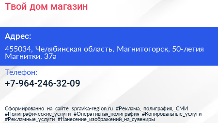 Твой дом, магазин по адресу 455034, Челябинская область, Магнитогорск, 50-летия Магнитки, 37а в дальнейшем Организация, размещена в следующих категориях: