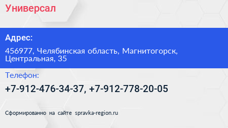 Универсал+ по адресу 456977, Челябинская область, Магнитогорск, Центральная, 35 в дальнейшем Организация, размещена в следующих категориях: