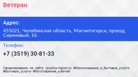Ветеран по адресу 455021, Челябинская область, Магнитогорск, проезд Сиреневый, 16 в дальнейшем Организация, размещена в следующих категориях:
