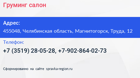 Груминг-салон по адресу 455048, Челябинская область, Магнитогорск, Труда, 12 в дальнейшем Организация, размещена в следующих категориях: