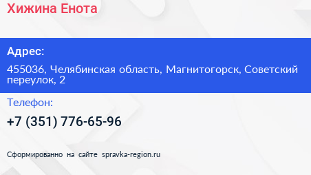 Хижина Енота по адресу 455036, Челябинская область, Магнитогорск, Советский переулок, 2 в дальнейшем Организация, размещена в следующих категориях: