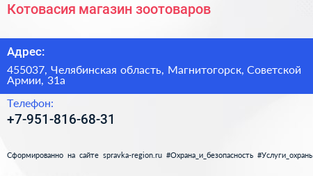 Котовасия, магазин зоотоваров по адресу 455037, Челябинская область, Магнитогорск, Советской Армии, 31а в дальнейшем Организация, размещена в следующих категориях: