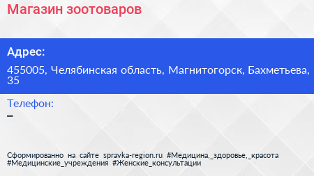 Магазин зоотоваров по адресу 455005, Челябинская область, Магнитогорск, Бахметьева, 35 в дальнейшем Организация, размещена в следующих категориях: