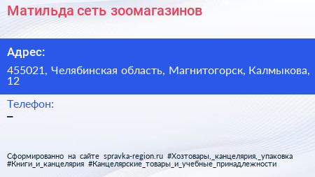 Матильда, сеть зоомагазинов по адресу 455021, Челябинская область, Магнитогорск, Калмыкова, 12 в дальнейшем Организация, размещена в следующих категориях:
