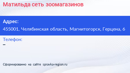 Матильда, сеть зоомагазинов по адресу 455001, Челябинская область, Магнитогорск, Герцена, 6 в дальнейшем Организация, размещена в следующих категориях: