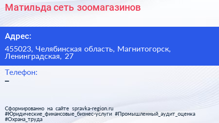 Матильда, сеть зоомагазинов по адресу 455023, Челябинская область, Магнитогорск, Ленинградская, 27 в дальнейшем Организация, размещена в следующих категориях: