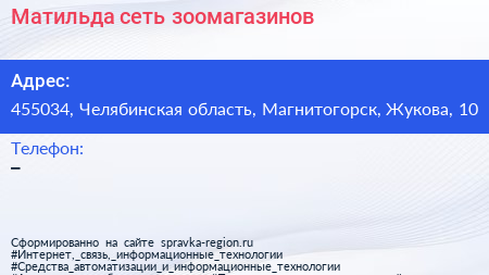 Матильда, сеть зоомагазинов по адресу 455034, Челябинская область, Магнитогорск, Жукова, 10 в дальнейшем Организация, размещена в следующих категориях:
