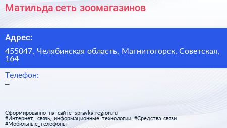 Матильда, сеть зоомагазинов по адресу 455047, Челябинская область, Магнитогорск, Советская, 164 в дальнейшем Организация, размещена в следующих категориях: