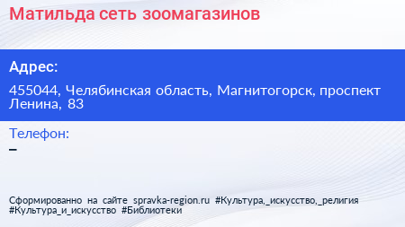 Матильда, сеть зоомагазинов по адресу 455044, Челябинская область, Магнитогорск, проспект Ленина, 83 в дальнейшем Организация, размещена в следующих категориях: